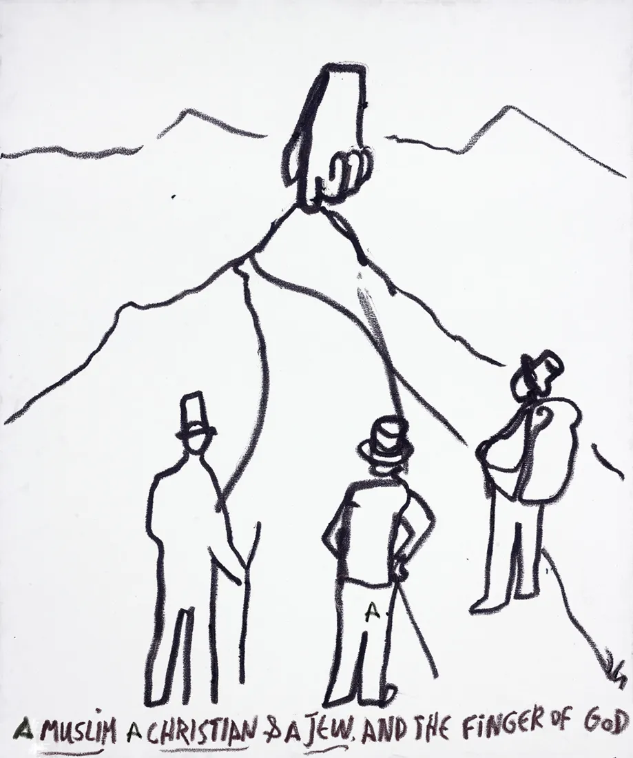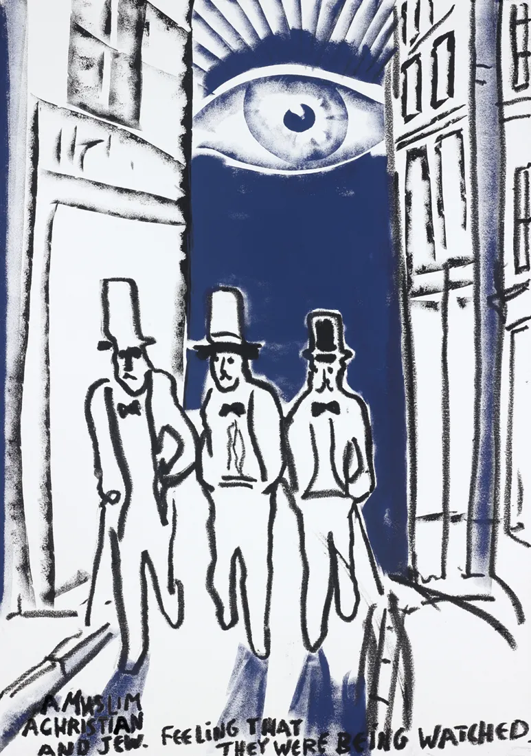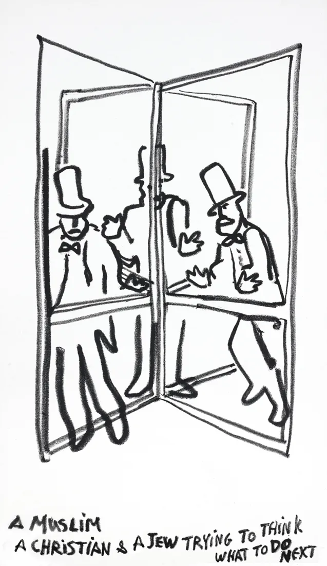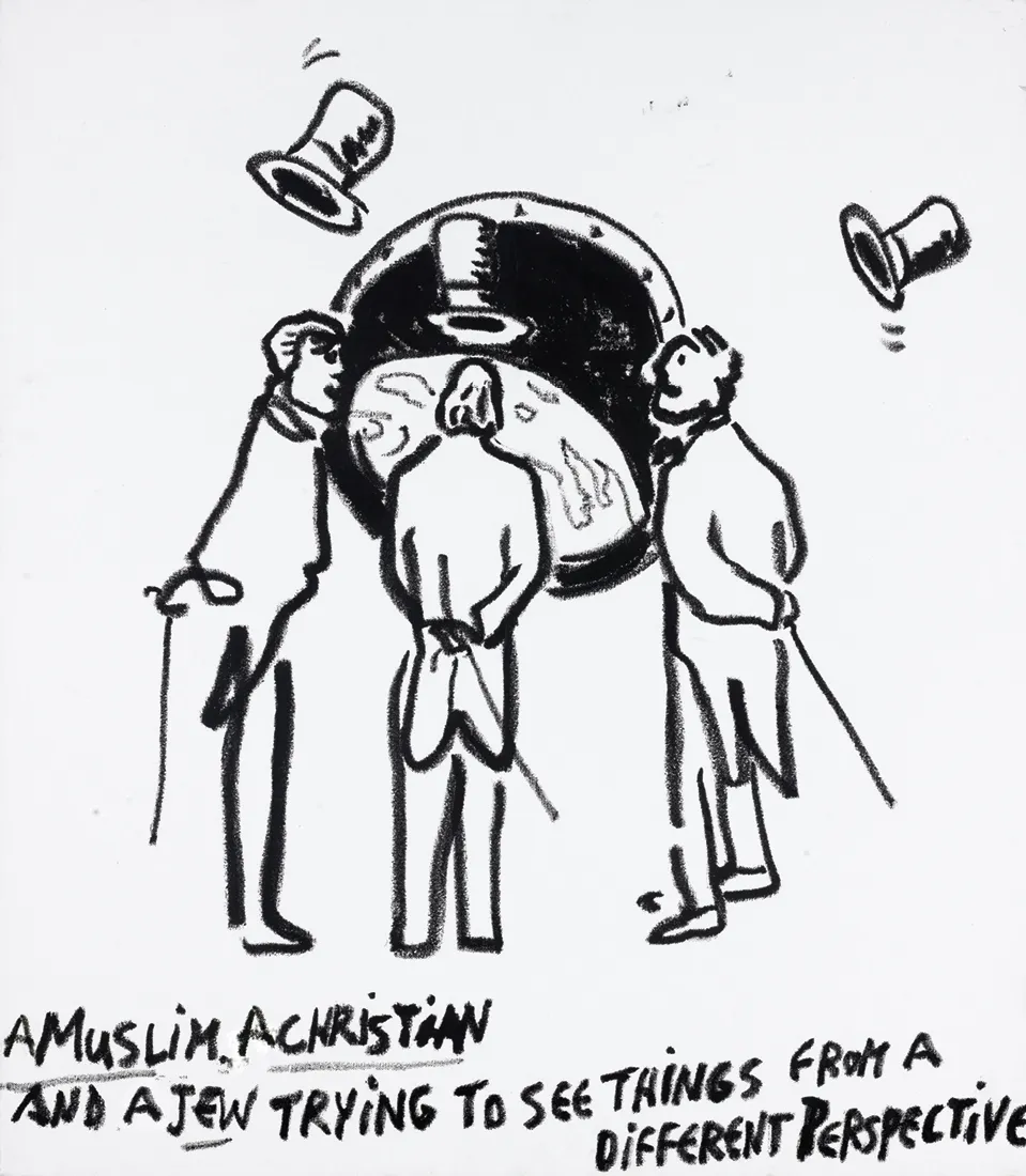 Der in Tel Aviv lebende Künstler Eran Shakine beobachtet in seinen Zeichnungen für Kursbuch 198, wie sich ein Moslem, ein Christ und ein Jude durch die Welt bewegen und wie sie sie wahrnehmen. Die drei wirken verloren, von der ewigen Suche ermattet. Gleichzeitig schöpft der Betrachter ungewöhnliche Kraft aus diesen Bildern, die ein verzweifeltes Bemühen nach dem eigentlich schon existierenden Verbindenden zeigen.