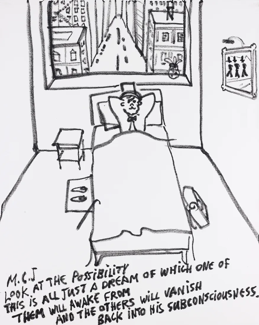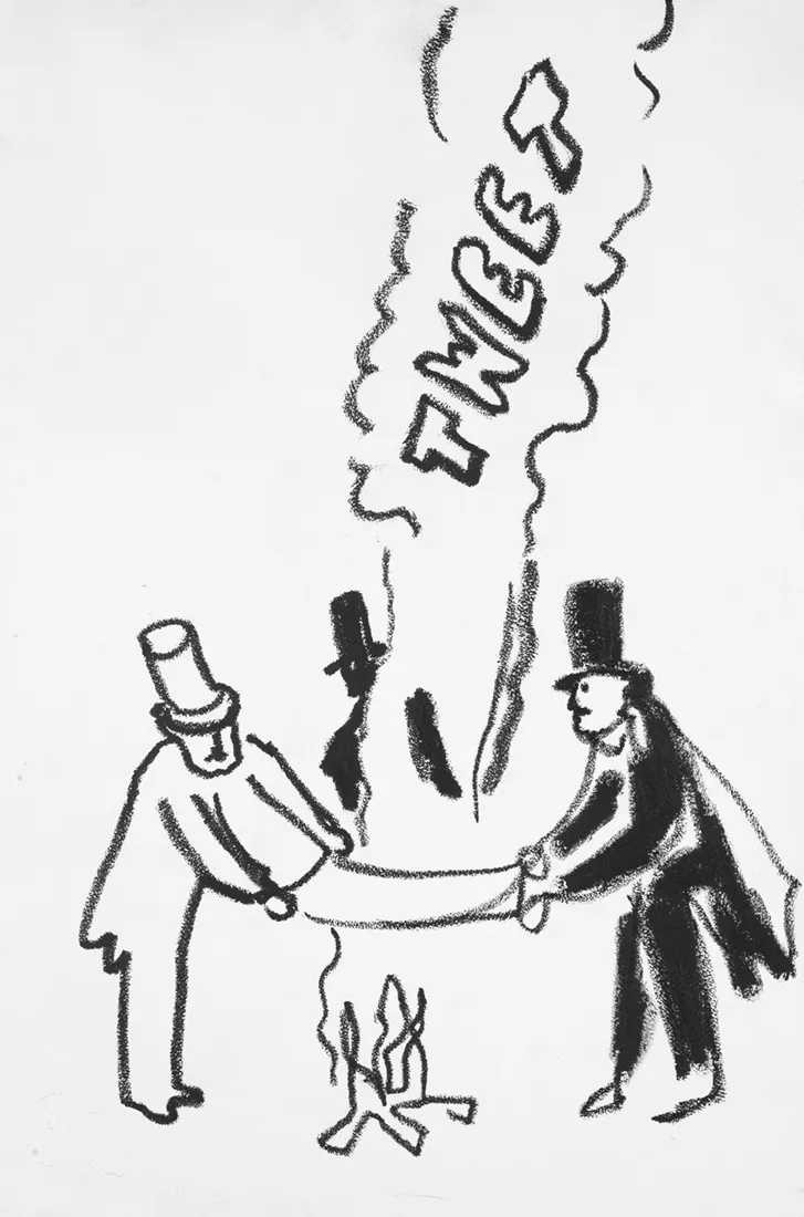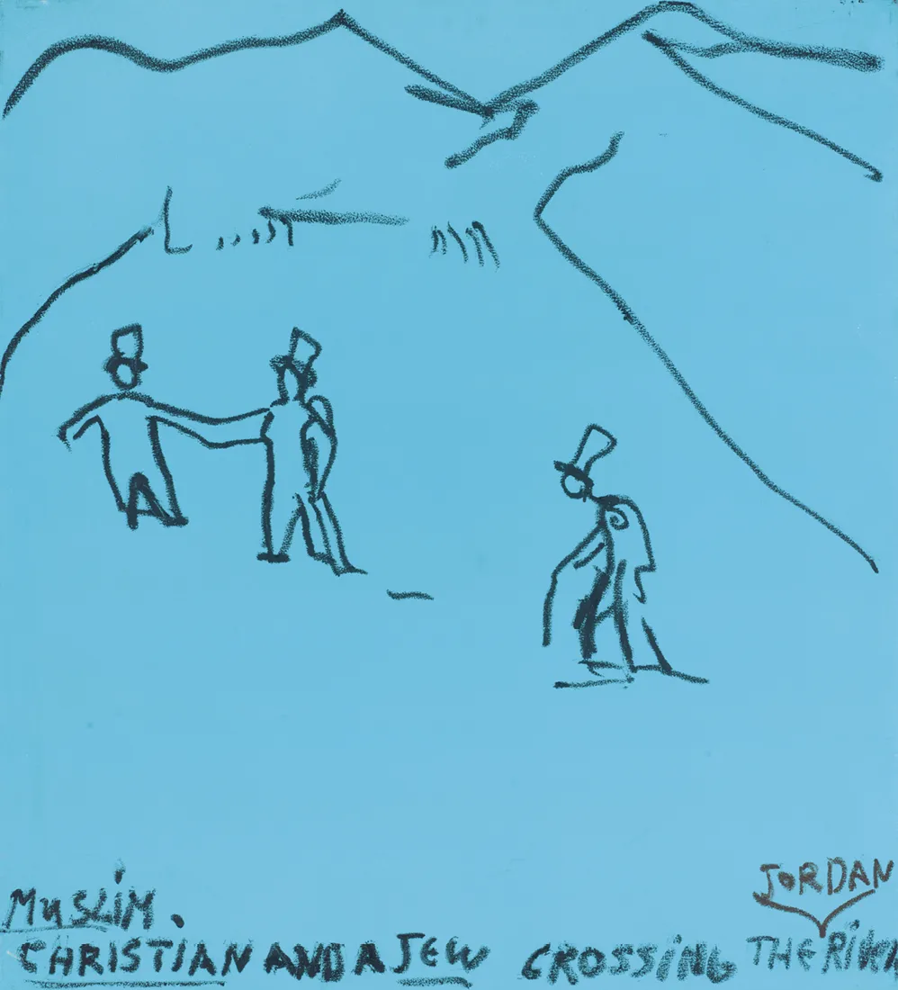 Der in Tel Aviv lebende Künstler Eran Shakine beobachtet in seinen Zeichnungen für Kursbuch 198, wie sich ein Moslem, ein Christ und ein Jude durch die Welt bewegen und wie sie sie wahrnehmen. Die drei wirken verloren, von der ewigen Suche ermattet. Gleichzeitig schöpft der Betrachter ungewöhnliche Kraft aus diesen Bildern, die ein verzweifeltes Bemühen nach dem eigentlich schon existierenden Verbindenden zeigen.