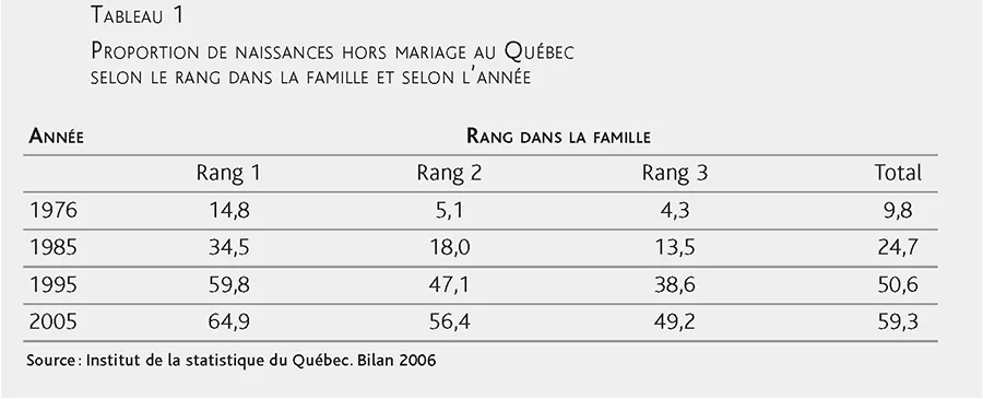 Cette « démocratisation de l’amour » a également une incidence sur le taux de divorce. Si l’on se marie parce qu’on s’aime, on se sépare dès que l’on ne s’aime plus. Elle a aussi une incidence sur le mariage lui-même. Quand le mariage n’est plus perçu comme un engagement pour la vie, quand il engage pour le meilleur mais pas pour le pire, il peut être aisément remplacé par l’« union libre », qui, en se diffusant à grande échelle, devient « union de fait ». Elle ne concerne plus seulement les ouvriers ou les couples mythiques (Jean-Paul Sartre et Simone de Beauvoir). Dans les années 1970 et 1980, l’union libre constitue le plus souvent un prélude au mariage. Par la suite, l’union de fait le remplace. Ce qui se donne à lire dans le taux d’enfants nés hors ma­­riage, qui, le plus souvent, sont reconnus par leurs mère et père. D’ailleurs, dans la plupart des démocraties occidentales, est abolie la distinction entre « enfants légitimes » et « enfants naturels ». Au Québec, le taux d’enfants nés hors mariage ne cesse de croître, quel que soit le rang de naissance des enfants (voir le tableau 1).