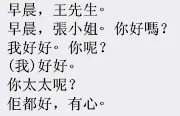 | Wong | Jóu-sàhn, Jèung Síu-jé. Néih hóu ma? | Good morning, Miss Cheung. How are you? |
