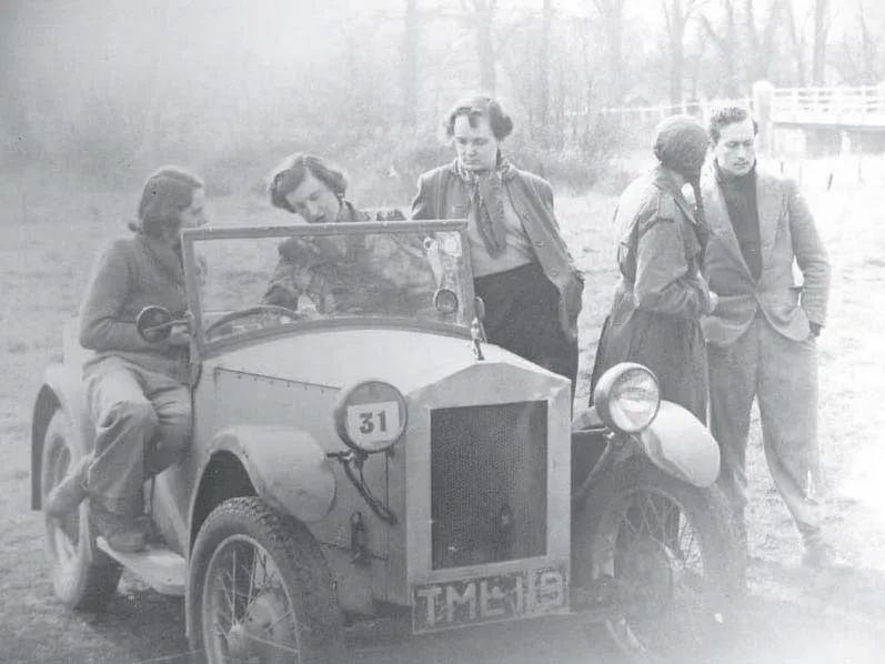 Colin Chapman, right, and a bunch of girlfriends cluster round the Mk 1 at a trials event in 1948.