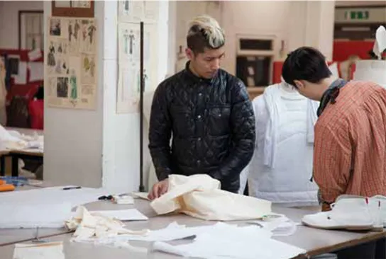 Fashion students working in a studio. The large table is essential both for cutting out and as a general work surface.