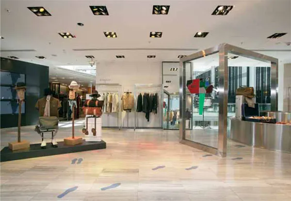 Not only has Lane Crawford, Hong Kong, created strong focal points to attract the customer on this menās floor, it has also added footprints on the floor to help guide the customer toward them.