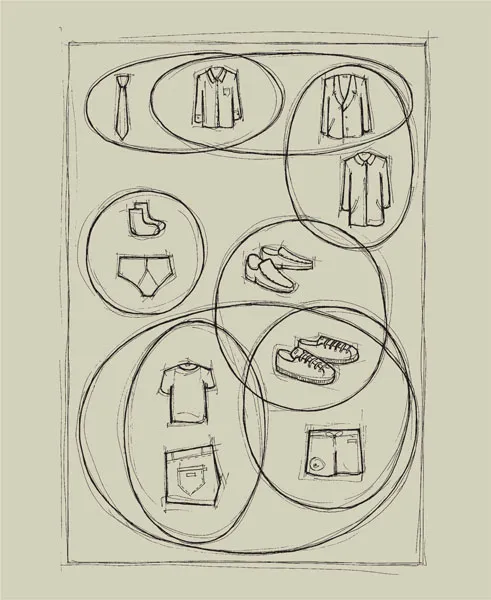 Making a rough plan of the products that should sit next to each other is the first step in laying out a shop floor. This is called making the product adjacencies. Ties, jackets, and suits or socks and underwear are two examples. Eventually, all the groups of product adjacencies will interlink to create one cohesive floor plan that contains them all.