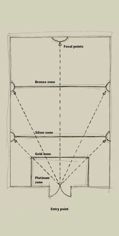 Once you have placed the product categories and brands roughly on the floor plan, you should visually walk the shop floor; the aim is for your eye to follow naturally from one category to the other.