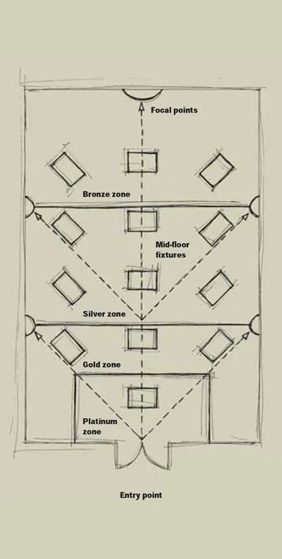 The starting point is product adjacencies. This refers to which products sit next to each other: hosiery next to lingerie, kettles next to toasters, and fruit next to vegetables. To maximize the space and use of the selling floor, the customer should be guided through the fixtures and aisles from one product to the next. By placing products that have empathy with each other, customers will not get confused and possibly pick up other items for which they may not have specifically been shopping. Clever use of product adjacencies will reinforce the appearance of the area and give it authority. A handbag fixture positioned next to scarves, gloves, hats, and purses suddenly becomes an accessory department.