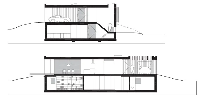 House S, with a floor area of 288 m2 (3,100 sq ft) over two levels, is built on a sandy hill overlooking the sea in the city of Breda in the Netherlands. The box-like house offers a scenic exterior view from the upper-level living spaces. The home office is located in the basement, where the owner works and meets clients.
