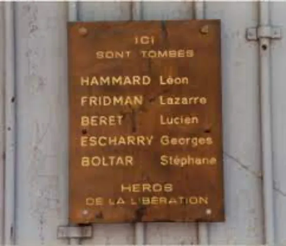 Une plaque à l’angle de la rue des Martyrs de la Libération (à côté du Monument de la Résistance).