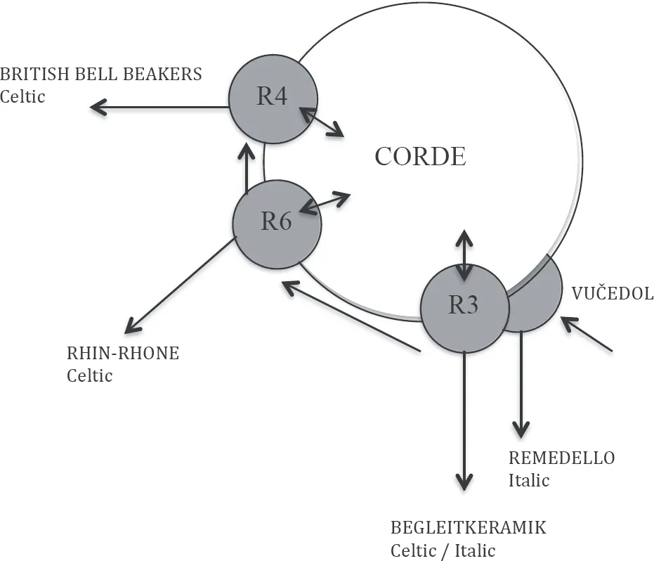The association of the Bell Beaker Folk with the ancient speakers of Celtic is already traditional. We find it in the works of Celtic linguists and historians and Bell Beaker archaeologists. This approach has triggered consequences. Thus, the identification was adopted, although somewhat reluctantly, in very influential The Celtic Realms by Nora Chadwick and Myles Dillon (1967, 18–19), and is still alive and well in a number of recent publications on various Celtic linguistic matters. A more elaborate association of the Folk or, rather, Phenomenon, with the Celts comes from the camp of archaeologists. Thus, at the 1998 Beaker Congress Professor A. Gallay (2001) sought to show that the Pre-Celts and Pre-Italics emerged from the complex of Bell-Beaker setting (Fig. 1.1).
