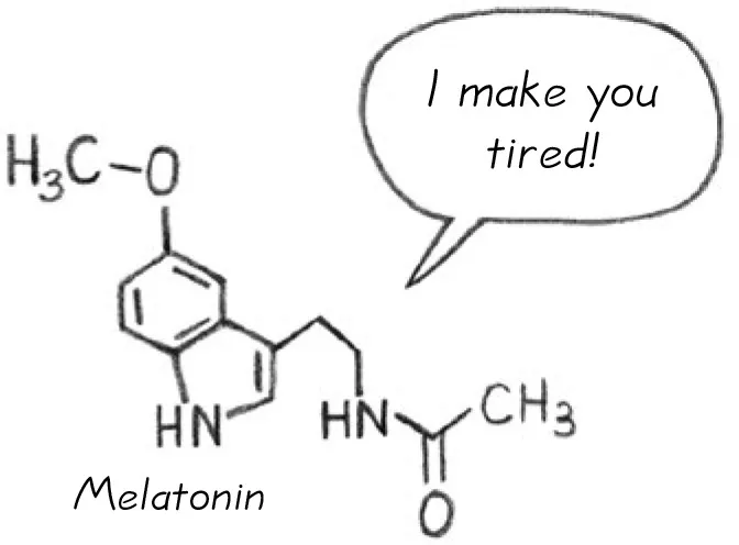THE MOLECULE MELATONIN is also popularly known as the “sleep hormone.” It’s produced in the pineal gland, a small gland in the middle of the brain. There’s a very good reason for its nickname; melatonin plays an important role in our circadian rhythm (from the Latin circa dies, “around the day”), our internal sleep-wake cycle. The higher our melatonin level, the more tired we feel. Conveniently, light helps to reduce melatonin concentration, and it finally seems to be having an effect on Matthias.