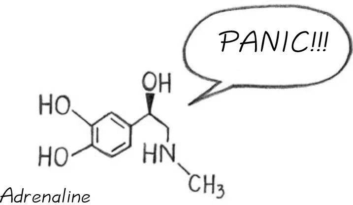 The molecules lying dormant in our bodies first need to be roused by some sort of trigger. In the Stone Age, this might have been a saber-tooth tiger; today, it’s Matthias’s monster alarm clock. The clock’s acoustic signal sends a nerve impulse from the brain to the adrenal glands via the spinal cord. Along with the pineal gland, the adrenal glands are among our bodies’ most important hormone factories. This nerve impulse causes the adrenal glands to release what is probably the best-known stress hormone—adrenaline, which is promptly pumped into the bloodstream and makes its way to various organs. A hormone is nothing more than a messenger substance, a molecule that carries important information. And in this case, the message is PANIC!!