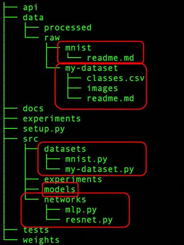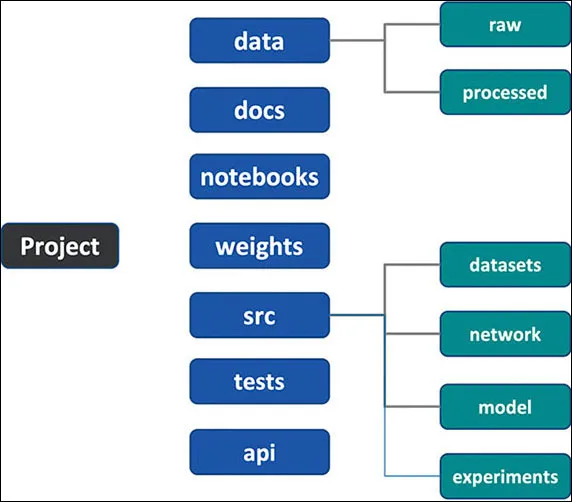 data/raw folder has a folder for MNIST (handwritten digit dataset) and some proprietary dataset. Let's call it "my-dataset." Essentially, each different dataset is maintained in its own respective folder.image class names mentioned in a csv but the actual images are dumped in a single folder. Maybe the second dataset that you collected from somewhere else has the image class name mentioned in the file name itself. It is worth reiterating that this data should never be changed.data/processed folder should maintain the processed data. In this case, it could be normalized data ready for training. The models' folder, as the name suggests, would contain the trained models.network folder defines the network architectures used. Think of it as a block which only defines the computational graph without caring about the input and output shapes, model losses, and training methodology. The loss function and the optimization function can be managed by the model. However, how does this help?