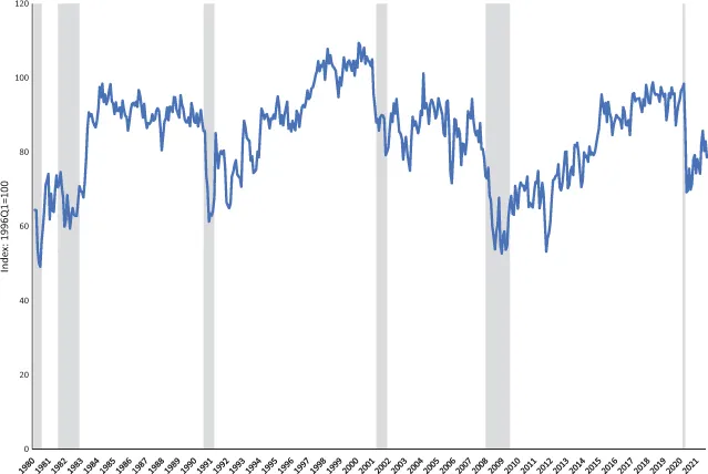 To see the importance of confidence another way, see Figure 1.1 which displays the index of consumer sentiment, where the data are collected by surveys conducted by the University of Michigan: