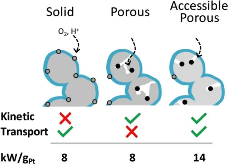 Figure 1.1 ORR kinetic and transport (O2 and proton) characteristics of catalyst layer structures made from three types of carbon (gray). Small black and gray circles represent relatively high and low activity Pt particles, respectively, due to ionomer (blue) adsorption [5].