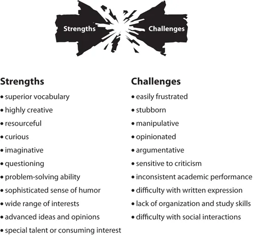 Their unique characteristics can thrust twice-exceptional children into emotional frustration (Nielsen & Higgins, 2005). Twice-exceptional learners struggle to achieve in areas impacted by their disability, but find it easy to achieve in areas not associated with their disability which is confusing to the student, their parents, and teachers (Maddocks, 2018). The extreme frustration these gifted learners feel when they cannot meet their own or others’ expectations, combined with the frustration of teachers who cannot understand why a bright child does not achieve, leads to conflict, misunderstandings, and failure in school. They can appear stubborn, opinionated, and argumentative, yet they also can be highly sensitive to criticism. Many twice-exceptional learners have limited social and/or emotional skills (Nielsen, 2002; Reis et al., 1995) and can become the target of peer bullying, which leads to feelings of isolation when they are unable to experience normal peer relationships. In an effort to avoid failure, twice-exceptional learners may try to manipulate the situation. A refusal to complete assignments may be an attempt to avoid failure. When faced with failure, twice-exceptional learners can become very anxious, angry, and depressed. It is the contrast between the student’s abilities and disabilities that creates conflicts and tends to makes school a frustrating experience for the twice-exceptional learner, their parents, and teachers. Figure 1.1 provides a visual representation of the combination of contrasting strengths and challenges that creates academic, social, and emotional problems for twice-exceptional learners. Use this figure to help students, parents, and teachers understand how the strengths and challenges influence the achievement and behavior of twice-exceptional learners. Figure 1.2 provides a more extensive list of twice-exceptional characteristics. Copy this list and ask teachers and parents to identify specific strengths and challenges of a twice-exceptional learner. This information will be used to identify needs in the Twice-Exceptional Planning Continuum, presented later in this book.