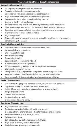 Twice-exceptional children lack the skills they need to be successful in school even though they have the characteristics of gifted students. The academic performance of twice-exceptional learners can be inconsistent with reported problems with reading, expressive language, writing, and math skills (Nielsen, 2002; Reis et al., 1995). Cognitive processing deficits in auditory processing, visual processing, and processing speed decreases their ability to process information and negatively influences their academic achievement. Lack of organizational skills results in messy desks, backpacks, lockers, and problems keeping track of papers. Deficits in prioritizing and planning make it difficult for them to complete assignments in a timely manner. They are easily distracted and experience difficulties in focusing and sustaining attention (Reis et al., 1995). Problems with gross and fine motor coordination are evidenced by poor handwriting and lack of coordination when playing sports (Weinfeld et al., 2002). Many twice-exceptional learners experience short- and long-term memory deficits, making it difficult to memorize math facts and remember names of letters and grammar and spelling rules. They have difficulty thinking in a linear fashion and may be unable to follow directions (Nielsen, 2002).