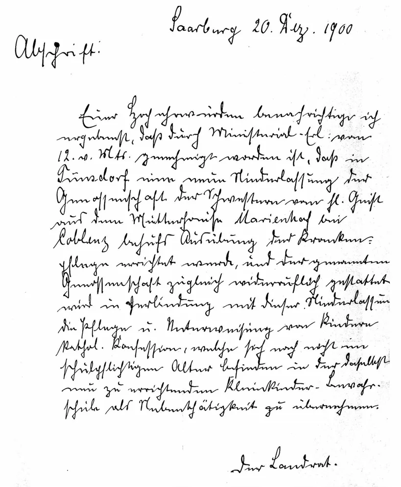 Abb. 1: Benachrichtigungsschreiben des Saarburger Landrats zu den erteilten staatlichen Genehmigungen im Rahmen der Klostergründung in Tünsdorf