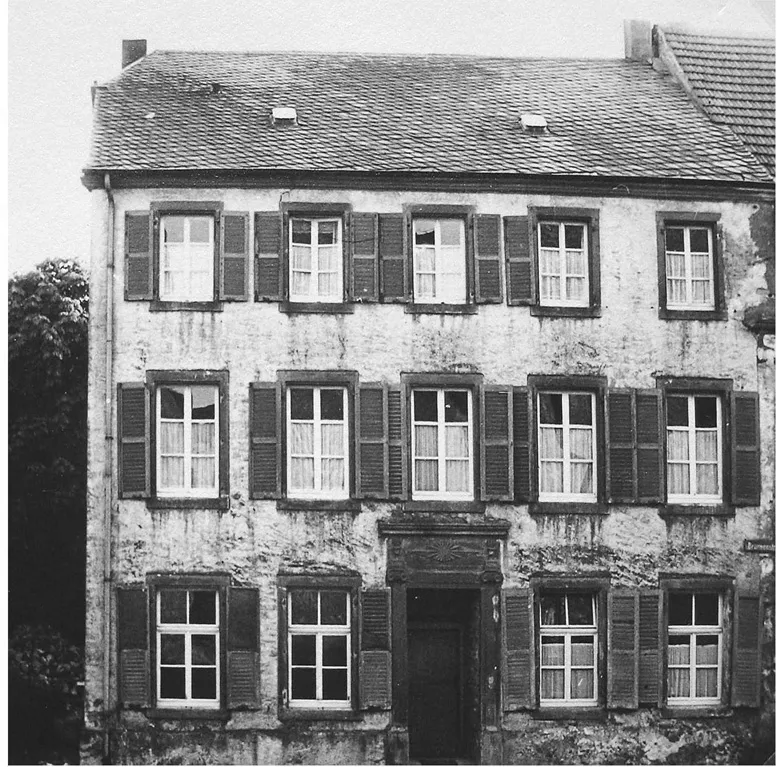 Abb. 2: Das Foto aus den 1940er-Jahren zeigt das zumindest äußerlich bis dahin stark heruntergekommene erste Klostergebäude der Tünsdorfer Schwestern von 1901 bis 1912. Das Nachbarhaus links („Dachsenhaus“, Küsterwohnung) ist nach schweren Beschädigungen im Zuge der Sprengung des Kirchturms 1939 durch deutsches Militär bereits abgerissen.2