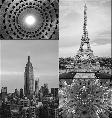 Abbildung 1: o.l.: Pantheon; u.l. Empire State Building; o.r. Eiffelturm, u.r. Sagrada Familia