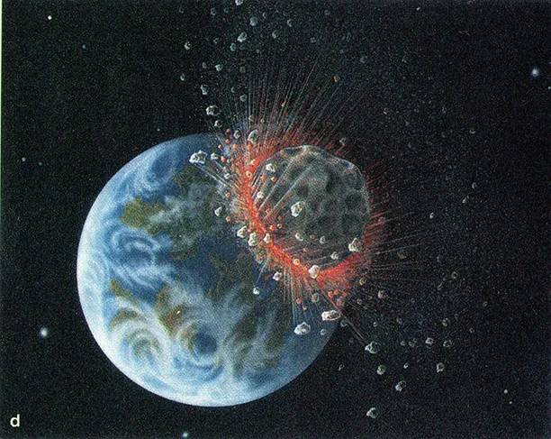 In diese Zeit fiel auch die Kollision der Erde mit einem etwa Mars-großen Planeten oder mehreren Teilen davon, aus der sich der Erdmond bildete: