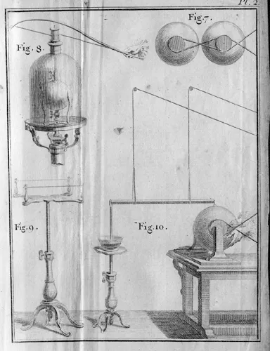 The electric egg was a strongly made oval glass vessel, similar to an electric bulb, and when exhausted by an air pump and subjected to the transmission of an electric current produced by means of a frictional machine, it gave rise to a number of startling and colourful effects. These were not unlike the phenomena eventually produced in an X-ray tube of low vacuum. Nollet obtained his results by connecting his electrical generator to the electric egg by wires, which carried the discharges through the bulb (Figure 1.4). His observations were published in Paris in 1753.6 One day, out of curiosity, his fellow-worker, Charles François du Fay (1698â1739) suspended himself by a silken cord, and Nollet treated him to a charge of electricity from his frictional machine. He then touched du Fayâs hand, and a spark, as bright as it was surprising, was seen to pass between the two men. It was in 1734 that du Fay had noted that electricity was in two forms, which he called resinous and vitreous, now named as negative and positive terminals.