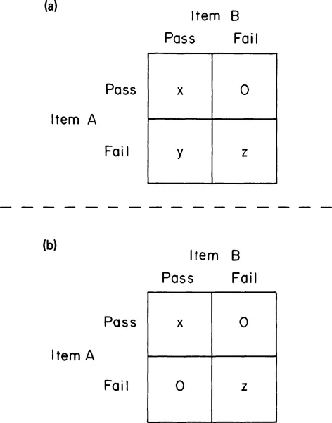 One fundamental problem in the study of cognitive development is the determination of the developmental relationship between particular cognitive skills. In the customary experimental paradigm, children are presented with a set of test items intended to tap the cognitive skills under investigation. The developmental sequence for any pair of items, A and B, can be determined by examining the fourfold table of passes and failures for the two items. For instance, if there are no occurrences in the pass A-fail B cell (Fig. 1.1a), then there exists strong evidence that the cognitive processes sufficient to pass item B are necessary to pass item 4; or, if the empty cells are pass A-fail B and fail A-pass B (Fig. 1.1b), then there is evidence that both skills appear simultaneously. The complexity of the questions raised by this problem is clearly illustrated by the research literature centered on the concept of âstageâ in Piagetâs theory of intellectual development. A comprehensive review of this work has been recently provided by Pinard and Laurendeau (1969). One of the most controversial issues which they discuss stems from Piagetâs contention that all of the groupings underlying the stage of concrete operations âappear at the same time without our being able to seriate (them) into stages [Piaget, 1941, p. 246].â Their review of the studies aimed at evaluating this assertion provides an inconsistent picture: some of the results support synchronism while others reveal asynchronism.