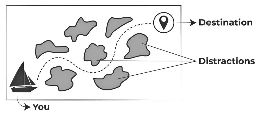 If you think of your life as a boat journey, your strategy is the map, the destination is the end goal, and your aspiration is why you want to get there. If the destination is not clear, you will be continuously tempted to choose another destination midway, when the journey gets rough, and settle for the distractions on the way (islands).