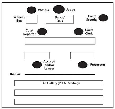 Figure 1 shows the layout of the court, and explains where the accused is expected to stand or sit in more detail. Not all courts are laid out in the same way, but most courts will have a number of similarities to the diagram, and include the following places: