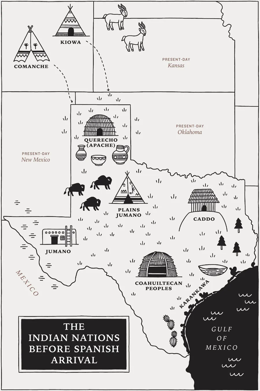By the beginning of the sixteenth century, Texas was well populated with indigenous peoples living in nomadic family groups or in settled villages that, according to one early Spanish estimate, might have had populations of up to ten thousand. They spoke a bewildering spectrum of languages, and were splintered into so many tribes and bands that Juan DomĂnguez de Mendoza, exploring Texas in 1684, counted sixty-four ânationsâ in attendance at some sort of rendezvous or trading fair on the Colorado River near present-day Ballinger.