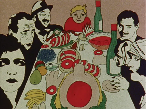 Please Don’t Bury Me (1976), the first of three cartoon films discussed here, was triggered by the lyrics of a John Prine song (see Chapter 2). “John” wakes up at the start of the film and then dies in his pyjamas. His body goes through various fantasy adventures concocted by me as a novice and self-taught director/animator: armless herself, Venus de Milo uses John’s cartoon arms to fire a machine gun; he saws off the feet of his own corpse in the back of a moving hearse; he is eaten by the Hollywood angels at a cartoon banquet in cinematic Heaven.