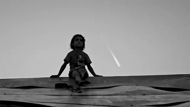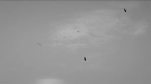 Figure1.1 A shot of the Sam daughter sitting on top of the family house with plane exhaust in the background (top, a) precedes a shot of vultures circling in the sky (bottom, b), communicating allegorical meaning about the precarity of ecological balance.