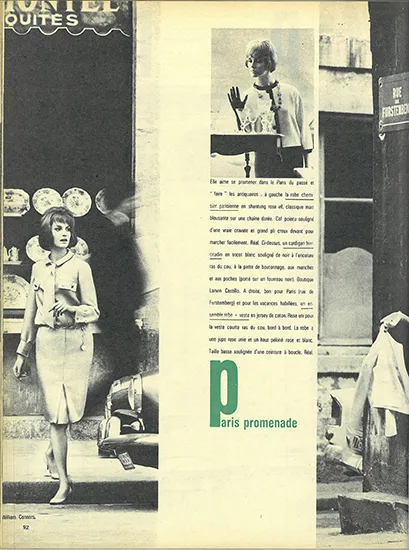 Modernity was a fraught concept in post-war France, in the throes of modernization – of its design industry and cityscapes, and in the lives of its newly enfranchised women citizens. The press’s presentation of readymade clothing reflected this tension, as illustrated by ‘Paris Promenade,’ a 1961 Elle editorial. Text captured the nostalgic mood of William Connors’s photographs of models, explaining, ‘She likes to stroll in the Paris of the past and “browse” the antiques.’12 Photography’s rise in French fashion magazines coincided with post-war renovations of the city, giving meaning to Susan Sontag’s observation that ‘a device is available to record what is disappearing.’13 The presentation of industrially produced readymade clothing in the press seemed to spur the need for such visual documentation of ‘Paris of the past.’14 Yet it was also visualized in ways that spoke to the changes taking place. For, in contrast to the model pictured in the upper right section of the page who peered at the antique glasses within a shop, the image at the bottom left depicted a woman with an outward gaze stepping into the street (Figure 1.2). This model walked away from the relics of French design, symbolized by porcelain tableware in the shop window; she looked to the present and not the past, to the freedom offered by the street and not the encapsulation of the interior, or photography studio. But she did not leave Paris, rather, her pink shantung shirtdress, or ‘robe chemisier parisienne’15 marked her as unquestionably Parisian. From the late 1950s, the fashion press abounded in images of shirtdresses, unfitted dresses typically with button closure to resemble a tailored blouse. Here, the author described the garment as ‘classique,’ but pointed out its novelty, made to look like a separate blouse and skirt with the addition of a gilt chain. Likewise, the dress, woman, automobile and the blurred presence of a hurried passer-by in the photograph became expressions of urban modernity when pictured against the architecture of nineteenth-century Paris.