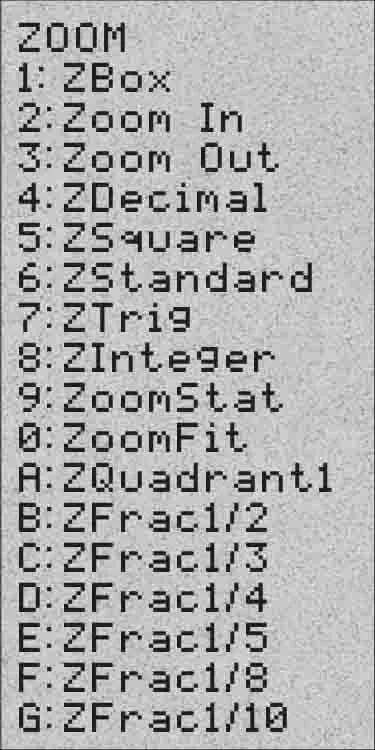 button displays any functions that are selected from the Y= editor. You can zoom in on parts of the graph or change viewing windows manually or by using preset values. More information about changing how a graph is displayed can be found in The WINDOW
