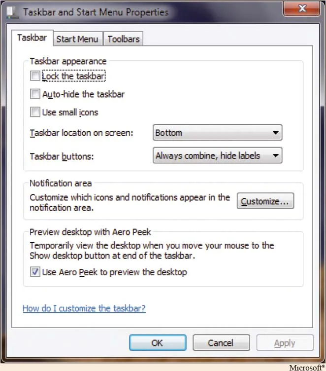 Windows 7 provides many options for customizing the operation and use of the Taskbar and the Start Menu; they are specified through the Taskbar and Start Menu Properties dialog box.