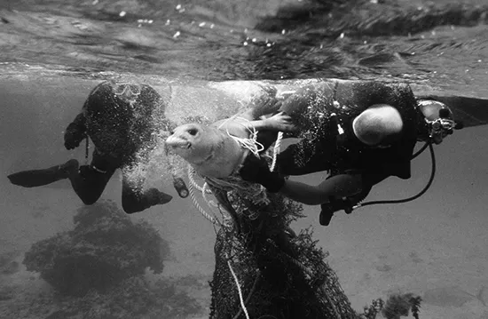 Figure 1-1: NOAA divers free an entangled Hawaiian monk seal at French Frigate Shoals, Northwestern Hawaiian Islands, during a marine debris survey and removal cruise. (Credit: Ray Boland, NOAA/NMFS/PIFD/ESOD)