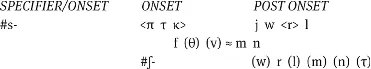 | SEMI-VOWELS | {u}\{V}: [w] | {i}\{ V}: [j] | {V} |