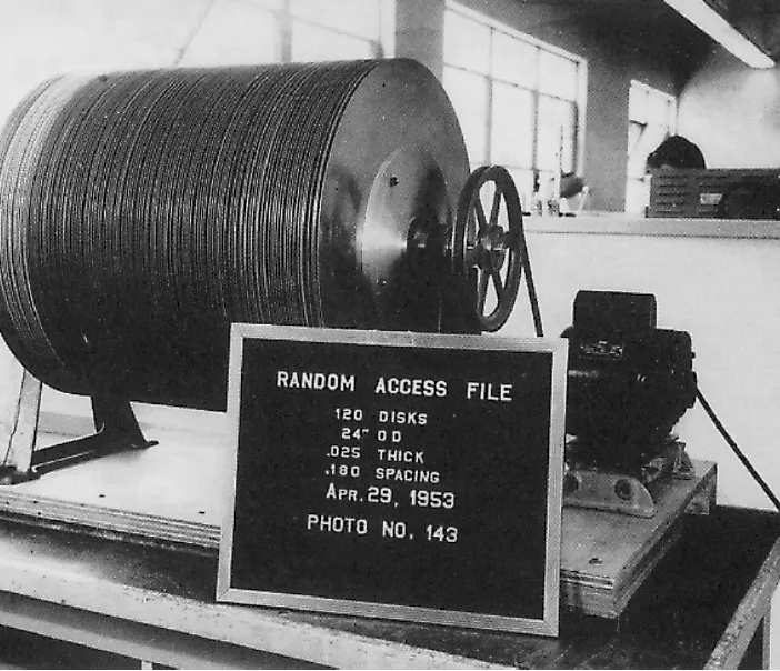 Un equipo de investigadores de los laboratorios de IBM en San José, California, desarrolló la primera unidad de disco entre 1952 y 1956. Denominada RAMAC (siglas de Random Access Method for Accounting and Control [Método de Acceso Aleatorio para Auditoría y Control]), era del tamaño de un refrigerador doméstico grande, constaba de cincuenta discos de veinticuatro pulgadas (61 centímetros), y podía almacenar hasta 5 megabytes (MB) de información (ver Figura 1.2). La mayoría de los conceptos fundamentales sobre la arquitectura y las tecnologías de los componentes que constituyen la base de los diseños de las unidades de disco de hoy en día fueron desarrollados también en IBM. Estas arquitecturas y tecnologías incluyen las unidades de discos rígidos removibles (introducidas en el mercado en 1961); las de discos flexibles (1971) y la arquitectura Winchester (1973). Todas ellas tuvieron una influencia poderosa y decisiva sobre la manera en que los diseñadores del resto de las empresas del sector definieron lo que constituía efectivamente una unidad de disco y lo que esta debería ser capaz de hacer.