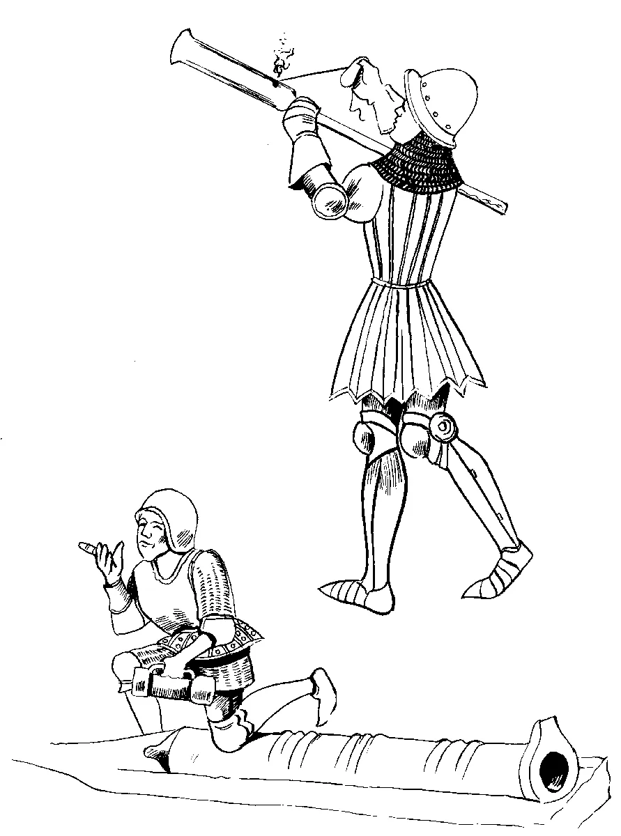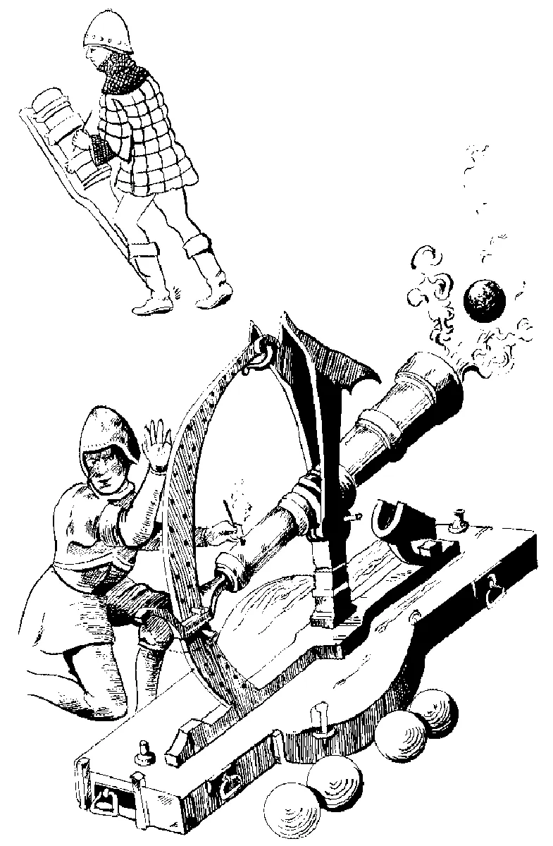 A medieval artilleryman firing a bombard, which has been aligned like a modern mortar. He is well protected with helmet, mail shirt and quilted jerkin. Developments in handguns and artillery created new areas of specialism within medieval armies which would later leave the heavily armoured cavalryman redundant. (Author’s collection)
