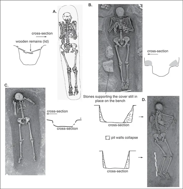 Figure1.1A. Signs of decomposition in a filled space of the skeleton of an individual buried directly in a pit dug in powdery wind-borne soil and closed with a lid (Porsuk, Ulukɩs, la, Turkey, 11th–12th centuries AD); B. The same signs of decomposition in a filled space in a narrow pit with a concave floor, closed with a lid held in place with blocks on a ‘bench’ (Les Ruelles, Serris, France, 10th century AD); C and D. Immediate infilling of the pit after burial (C: Grange-Rouge, near Louhans, France, 16th century AD) and (D) with pit wall collapse (Quincieux, Rhône, Les Forgettes, 8th–9th centuries AD) (Images: F. Blaizot).