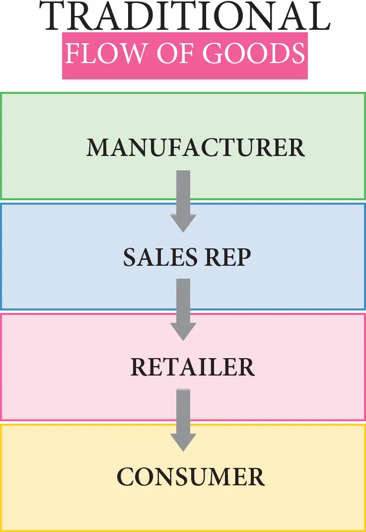 In the traditional marketing distribution channel, goods travel from the manufacturer, to the wholesaler, to the retailer, and finally to the consumer (see Figure 1.2). In each step of the process, the channel member buys the goods, takes possession of them and warehouses them. Therefore, with each step of the process, the channel member owns the goods, which requires expenditure and financial risk. This process is also time-consuming and costly. This adds to the mark-up making the goods more expensive down the line.
