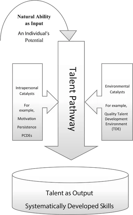To begin, let's consider what we mean by âtalentâ. It is such a common word, but definitions of talent are inconsistent. Talent is typically viewed as an individual's ability (innate talent) with little consideration of the process of development required to achieve expertise. This misunderstanding presumably underpins TI processes (scouting in soccer or more structured TI models) that seek to âtalent spotâ young athletes. However, these approaches to TI fail to distinguish between current performance (i.e., how well a young athlete is performing at the time of testing) and that individual's capacity for future development. Furthermore, since these TI models typically select young athletes based on a limited range of discrete variables (typically once-off performance and/or physical measurements), they fail to recognise the dynamic nature of TD. In this book, we are mostly concerned with the process of TD, which refers to the âpath from rank-novice to the most outstanding and distinguished accomplishmentsâ (Sternberg, 2003). It might be easiest to think of this in terms of âinputs and outputsâ (see Figure 1.1). Giftedness, the possession and use of high levels of natural abilities or aptitudes to a level that places a person in the top 10 per cent of their peers, is essentially the input to the TD pathway. This is the product that you will work within your coaching environment. Talent is the superior mastery of systematically developed abilities or competencies to a level that places an individual in the top 10 per cent of individuals active in that field â essentially the output of the system. Herein lies the complexity â how do we evaluate a young athlete's potential and predict their future success based on their current performance? In this chapter, and throughout the book, we will discuss how talent is influenced by a range of factors within your sport environment (stakeholders, opportunities, challenges), that it involves a process of becoming, and it is individual.