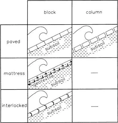 - – block mattresses, comprising small concrete elements bonded together by cables, or a geotextile.