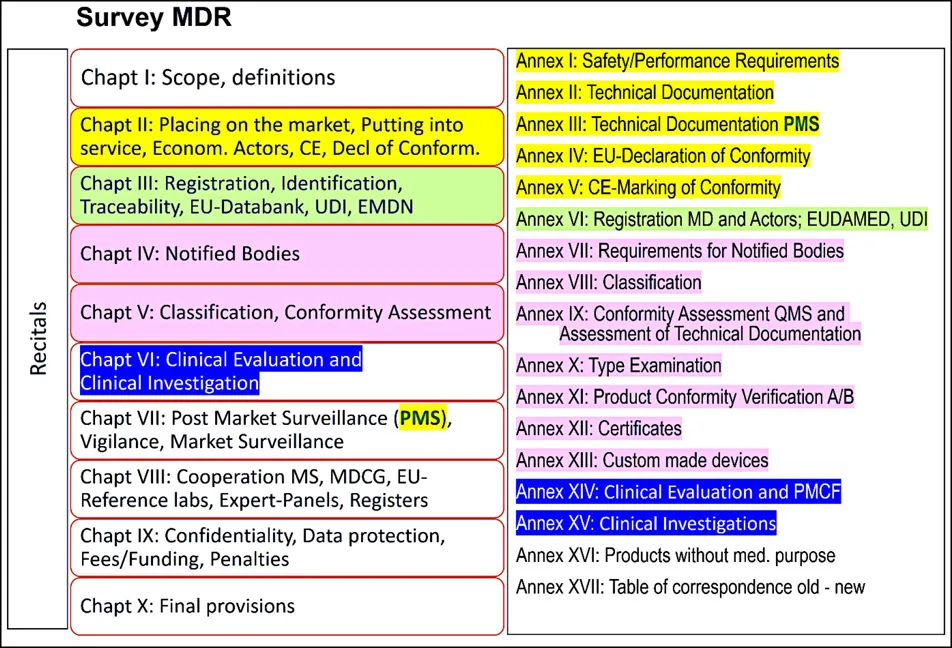 - the Annexes, the binding, more technically oriented legal text, which supplement the chapters (for example Annex I on General Safety and Performance Requirements [GSPR; Annex II and III on technical documentation or Annexes IX to XI on conformity assessment modules [= modules of "European Premarket Approval"]).