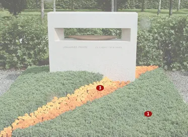Alternativen: Bodendecker wie Zwergmispel (Cotoneaster dammeri ), Buchsbaum (Buxus sempervirens) oder die Heckenkirsche (Lonicera nitida) wären hier denkbar – allerdings würde das Grab mit diesen Grüntönen ganz anders wirken. Für das Wechselbeet bieten sich im Sommer Studentenblumen (Tagetes) an, die das Farbspektrum Gelb, Rostrot und Braun abdecken. Als Herbstbepflanzung kommen Heidearten mit passend gefärbtem Laub in Frage.