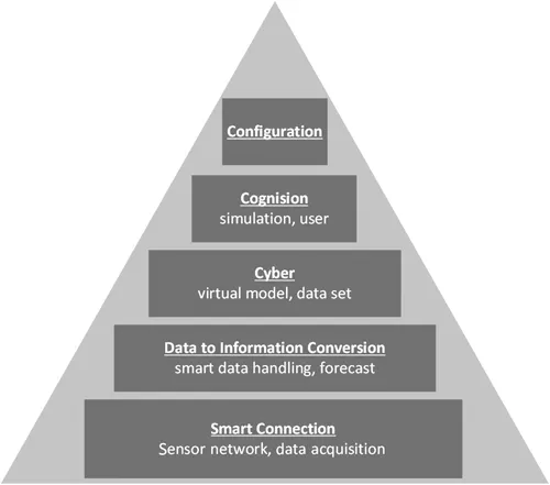 The CPS enables the simplification of the physical system and uses IoT to collect and exchange data and information between workers and external partners. Nowadays, it is important to provide real-time communication, not only between machines and products, but also between clients, service providers and stocks, most interactions of which should be autonomous. (Hermann et al., 2015). The 5C architecture of CPS (Figure 1.2) is proposed for manufacturing and allows the factors and resources of processes to be coordinated thanks to information and communications technologies and unlimited access to distributed industrial data (Pivoto et al., 2021).