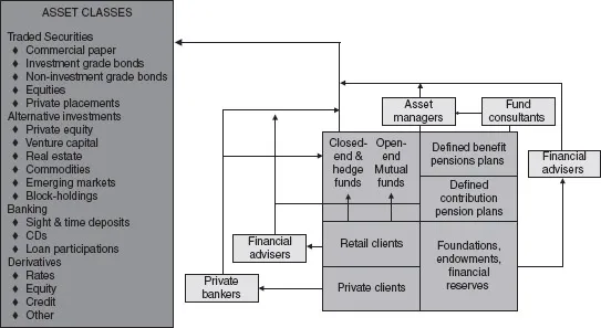 The layout of the global asset management industry can perhaps best be explained in terms of Figure 1.1. The right side of the diagram is the institutional side of the market for professional asset management and the left side is the individual side of the markets, although the distinctions are often heavily blurred.