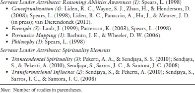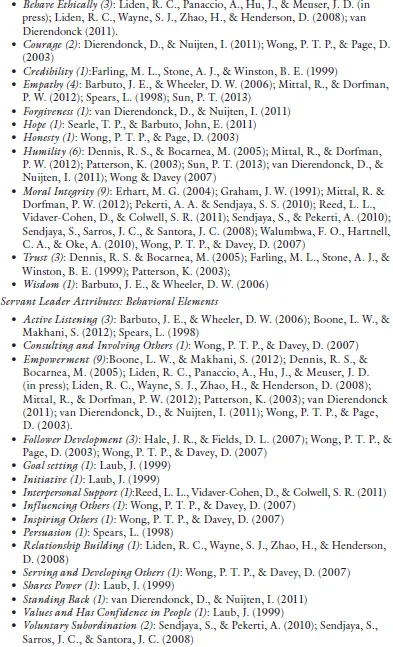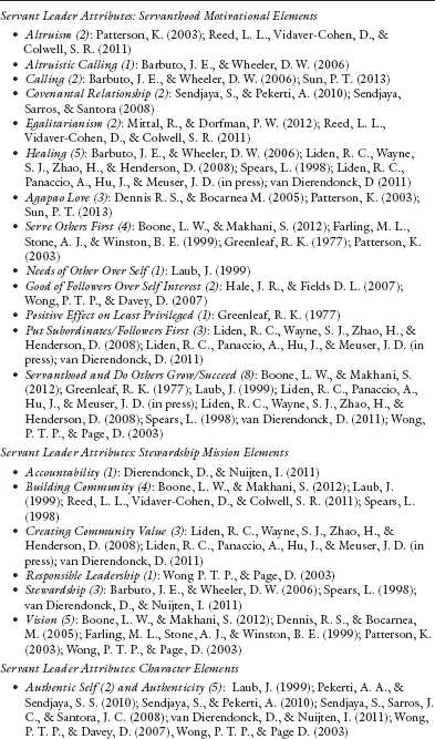 From a methodological standpoint, there is an absence of agreement on the specific elements and core dimensions of servant leadership (Northouse, 2013). However, this reflects the inherent complexity of servant leadership and its holistic and unique combination of leadership motivation, character, behavior, and reasoning abilities. Hence, it will take many years of sustained study to confirm the basic attributes and the many moderator and mediating relationships.