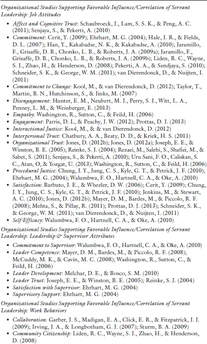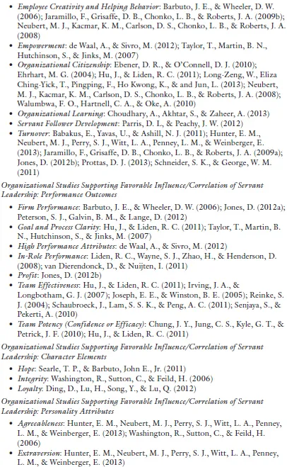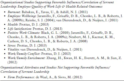 The table 1.2 provides a detailed summary of the published literature that supports Mayer (2010) and the other servant leader models. Servant leadership is associated with higher levels of organizational commitment, job trust, job satisfaction, procedural justice, and engagement levels, among others. In terms of the leadership outcomes, servant leadership is associated with higher levels of leadership competence, commitment to supervisor, and leader trust. In terms of behaviors, servant leadership promotes higher levels of organizational citizenship, employee creativity and helping behavior, and lower levels of organizational turnover. The favorable influence on productivity is equally impressive with multiple studies indicating higher levels of team effectiveness, team potency, goal and process clarity, and firm performance. Servant leadership enhances essential character attributes such as hope, integrity, and loyalty. Finally, servant leadership promotes a positive work climate, enhances quality of work life, leads to employee wellbeing, and reduces burnout and work family conflict. Only one study demonstrated no consistent influence of servant leadership on organizational performance (de Waal & Sivro, 2012). In conclusion, the conceptual and empirical evidence for the positive influence of servant leadership on a whole host of outcomes is very consistent and positive. However, there are several important caveats. The number of studies is small and their methodological scope and breadth limited, especially when contrasted with other areas of leadership research. There is also potential publication bias for servant leadership.