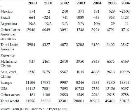 However, compared with the substantial increases in its investment in other parts of the world, Japanâs investment in Latin America has increased only gradually, as shown in Table 1.1. In Mexico, although investment had been on the rise until 2005 because of the positive effect of Mexico being a member of NAFTA, in 2006 it decreased by half to 1.773 billion dollars, with some enterprises transferring their site of production to China. (See Table 1.2.)