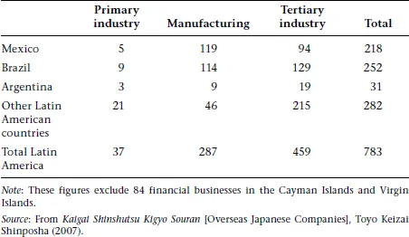 As we can see from Table 1.3, there are at least 783 Japanese-affiliated enterprises in Latin America. Of these, 287 belong to manufacturing and 459 belong to tertiary industries dealing with sales or service. In terms of the site of investment, more than 200 companies have invested in Mexico and more than 200 in Brazil, and these two countries account for about two-thirds of the whole investment in Latin America. (See Table 1.3.)